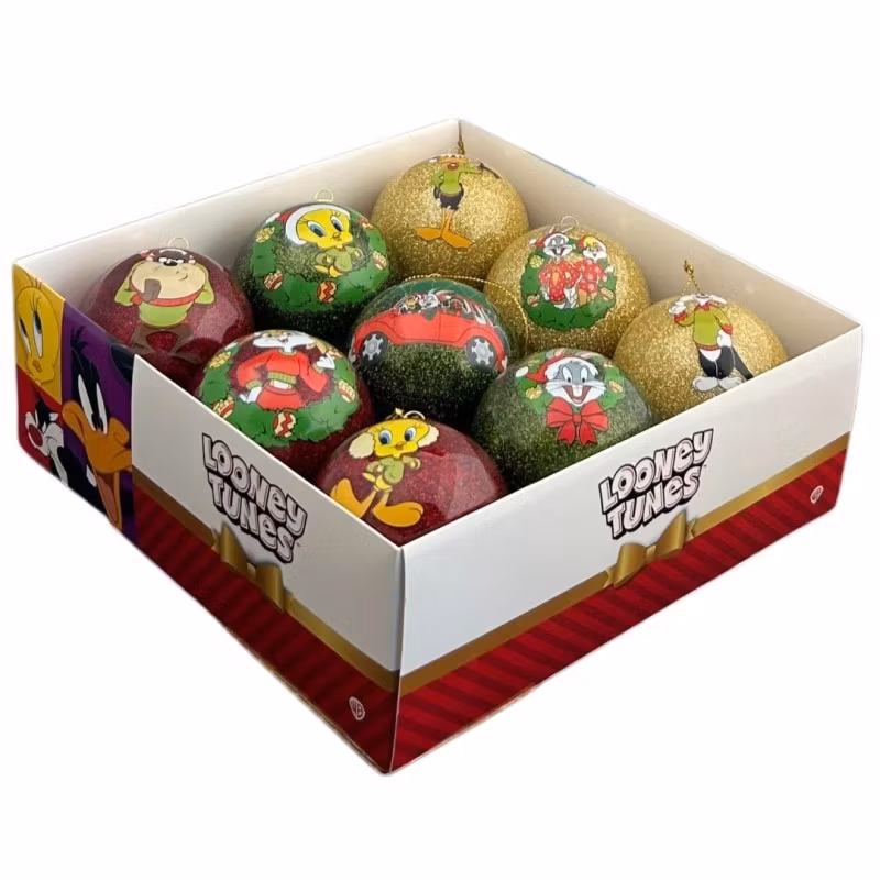 Her har vi 9 fantastiske og unike julekuler med bilder av kjente Looney Tunes figurer. Her ser vi Snurre Sprett, Sylwester og Piip, Daffy Duck, Den Tasmanske Djevel og Lola Sprett. Forskjellige farger og fine bilder, leveres i tilhørende eske.